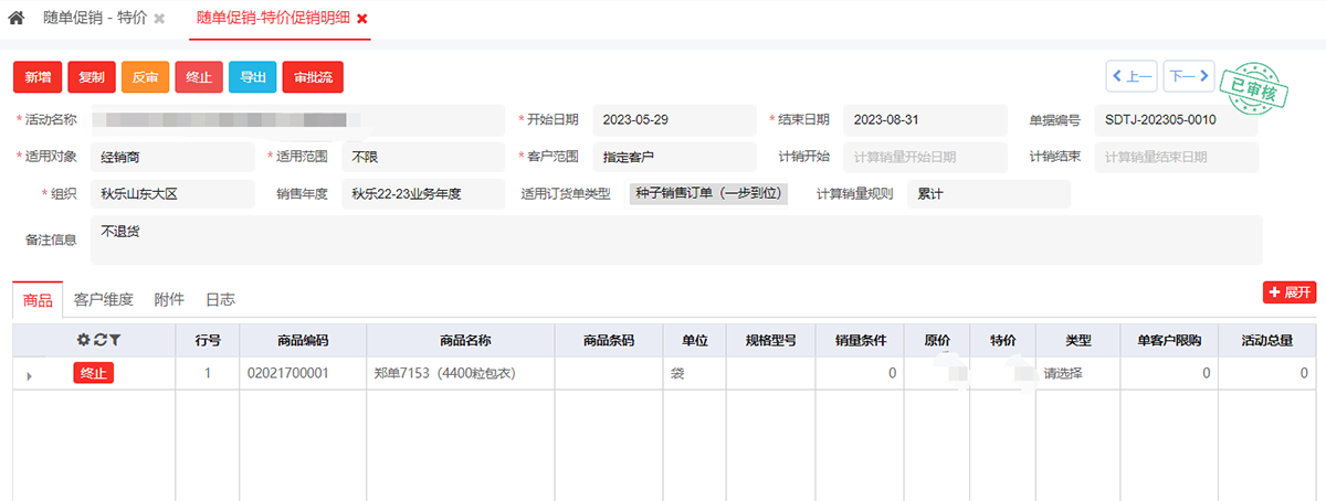 业务员可以通过PC端或者手机APP录入销售合同,并且可以选择商品分类和销售区域,从而实现对应订单的下单商品范围和收货范围的控制;可通过随单促销-特价来设置价格政策,支持多个维度按组织、区域、客户等设置商品的价格,下单展示最近政策价格,选择后自动带出价格。