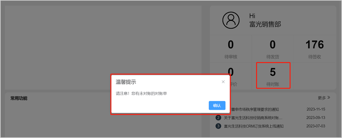 当对账单发出超过系统设置的期间时,经销商登录系统会收到富光生活公司发出的对账单,并发出提示框,提示经销商存在未对账的单据,请尽快完成对账动作。