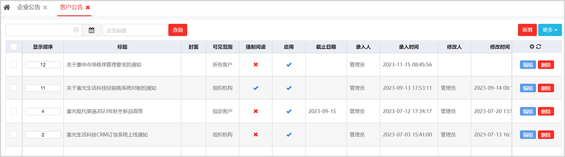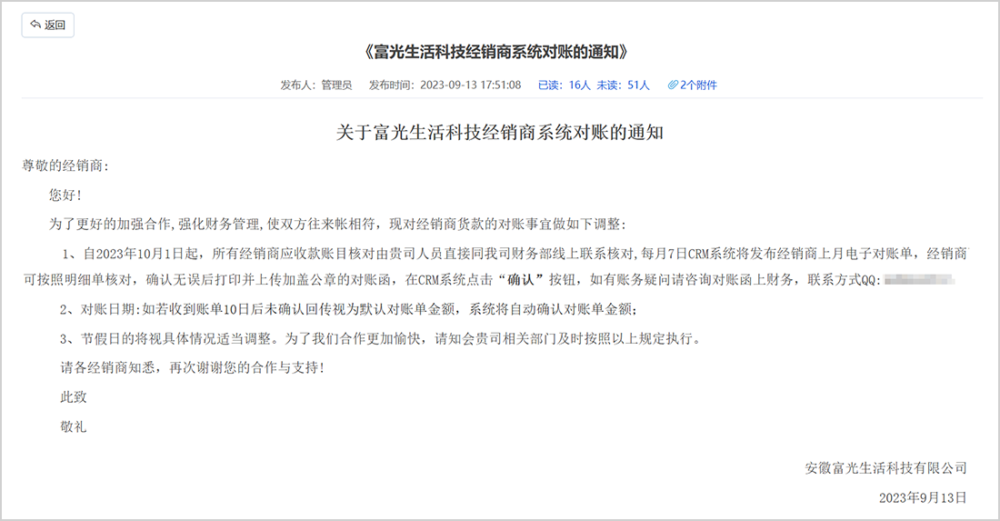 富光生活科技公司可发布客户公告给经销商,实现消息互通,政策快速传递。