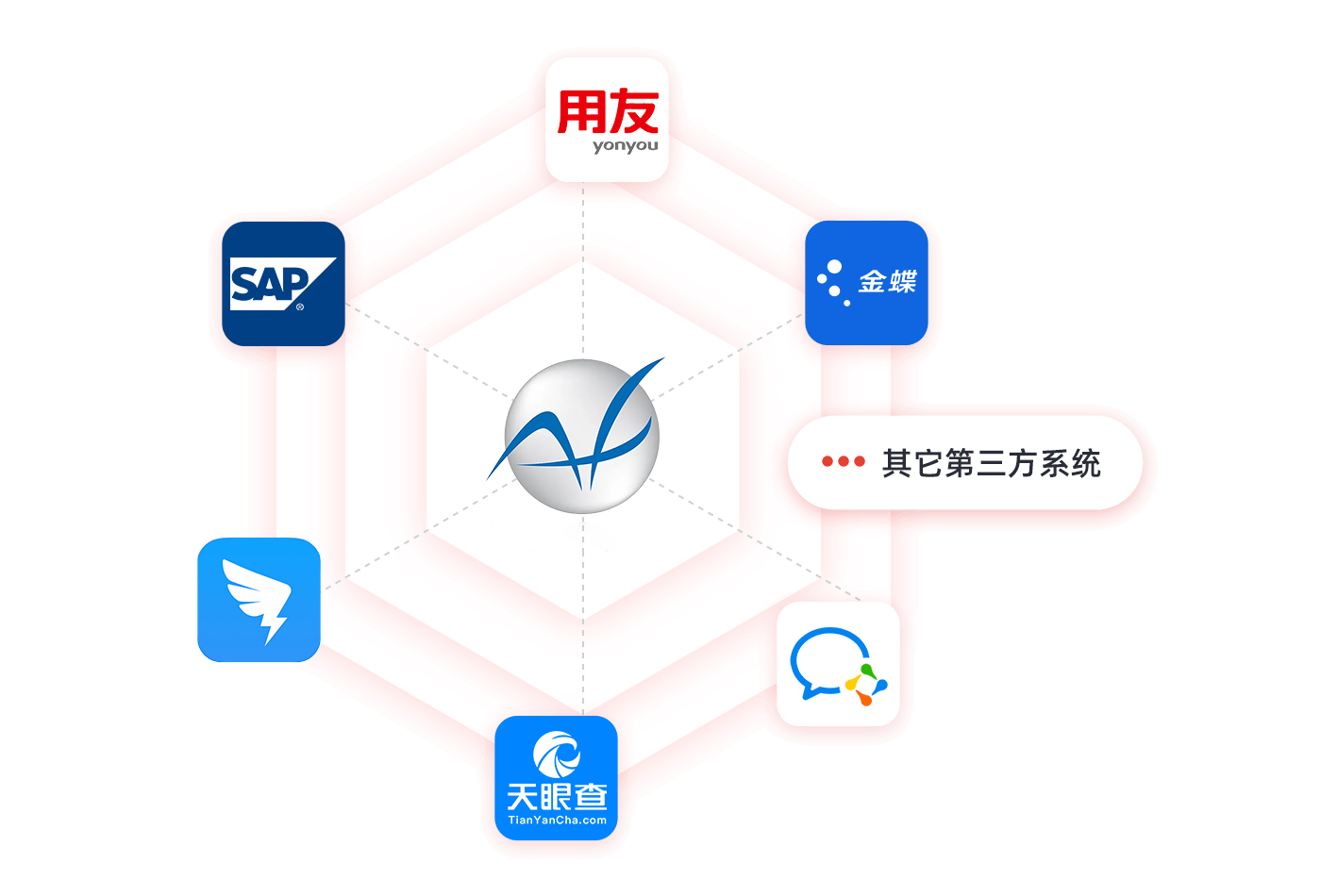 SAP、Oracle、金蝶、用友、鼎捷等ERP系统;泛微、致远等OA系统;微信公众号、天眼查等第三方工具软件;其它第三方系统。